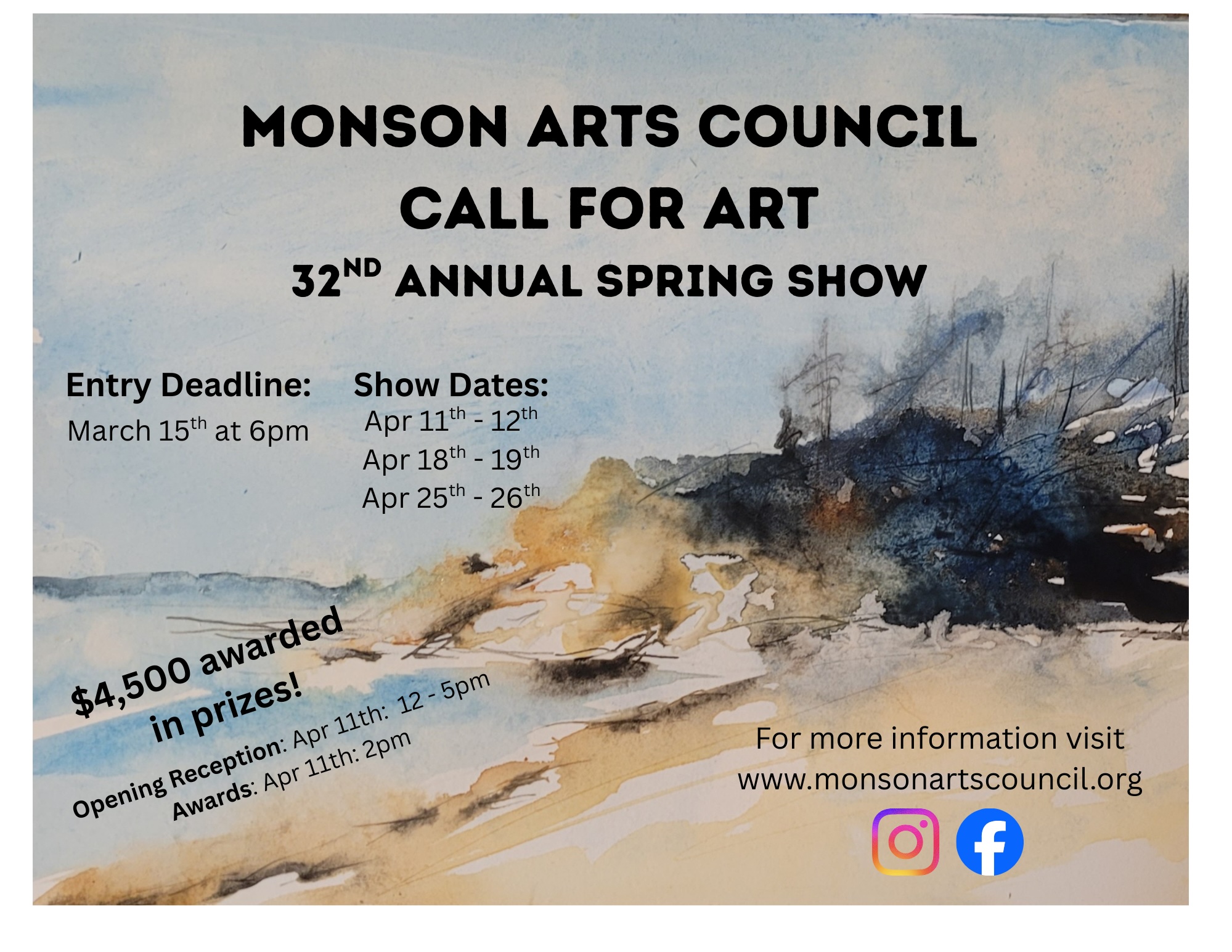 Artists are being sought in a range of media, including oil and acrylic, watercolors, mixed media and sculpture. All interested artists can go to our website at https://monsonartscouncil.org/spring-exhibition-and-sale-2026/ for entry details – The deadline for entry is March 15th at 6:00pm.